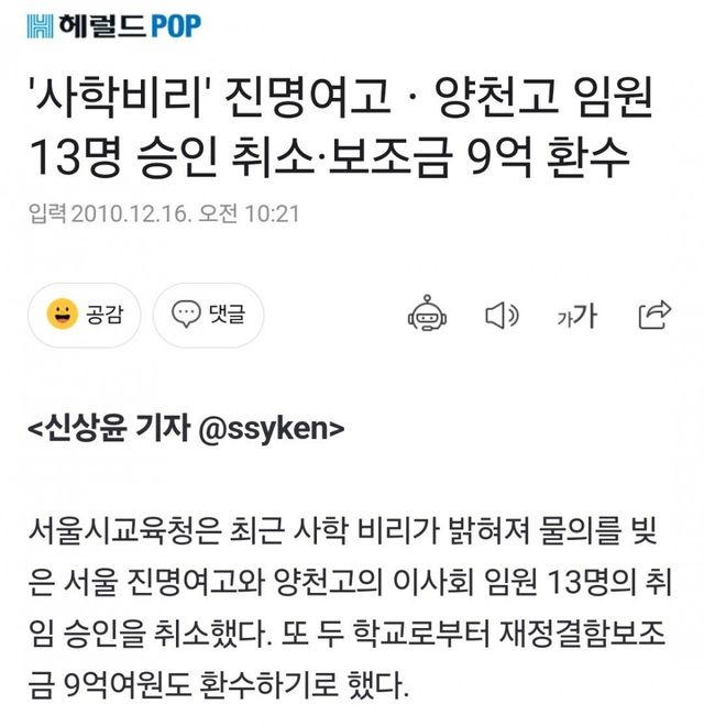 9. 양천고 사학비리 개털림. 임원 13명 승인 취소되고 보조금 9억 환수됨