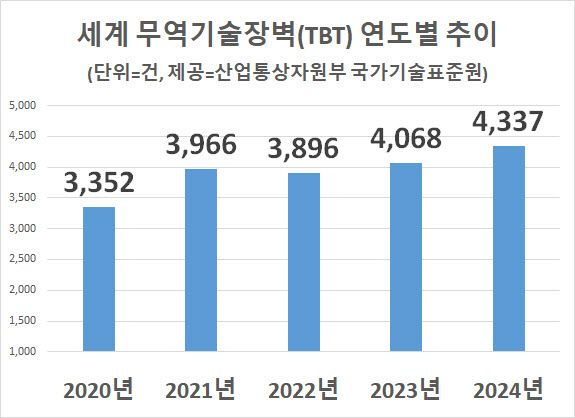 12일 산업통상자원부 국가기술표준원(이하 국표원)에 따르면 세계 각국이 지난 한해 세계무역기구(WTO)에 통보한 무역기술장벽(TBT, Technical Barrier to Trade) 건수는 4337건이었다. 역대 최대였던 전년 4068건보다 6.6% 늘어난 수치다. WTO 회원국은 TBT 협정에 따라 무역에 주요한 영향을 끼치는 기술 규정이나 표준, 적합성평가 절차를 바꾸면 이를 WTO에 통보해야 한다.