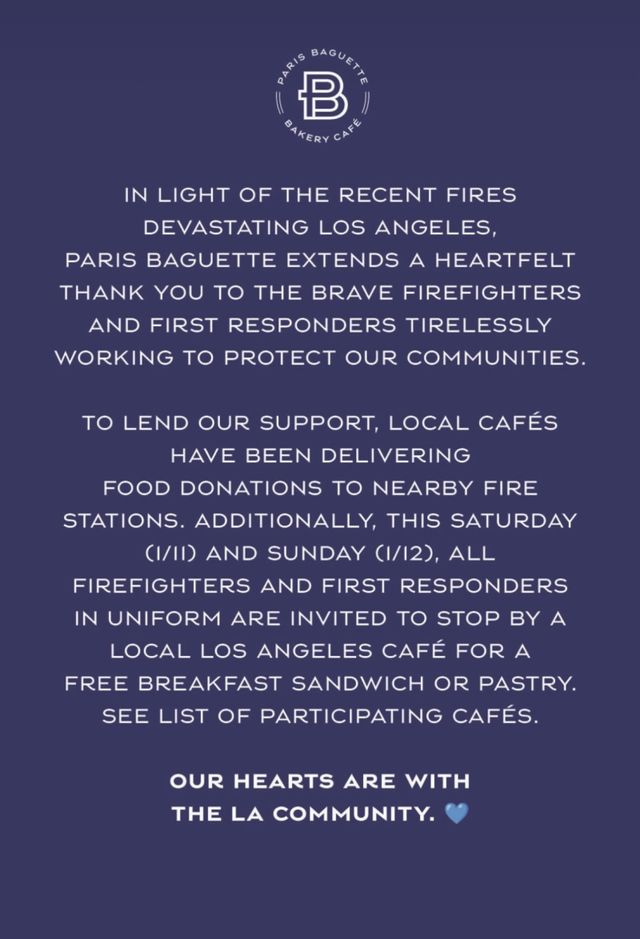 파리바게뜨 아메리카본부 측은 “‘지역 사회 기여’라는 브랜드 방침을 실천하고자 가맹점들과 함께 소방관들을 지원하게 됐다”며 “LA 지역 사회가 어려움을 극복하는 데 조금이나마 도움이 되길 바란다”고 말했다. 이어 “이번 산불로 직접적으로 피해를 본 매장은 없는 것으로 확인됐다”며 “직원들의 안전을 최우선으로 고려하도록 매장에 당부하고 있다”고 말했다.