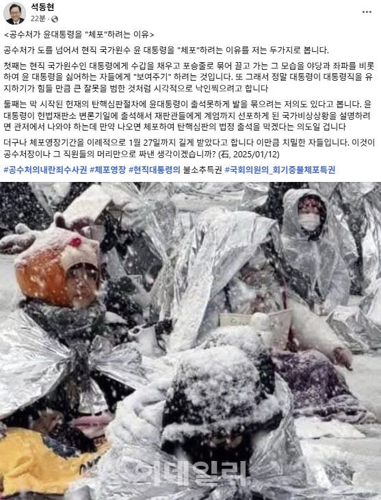 12일 석 변호사는 개인 사회관계망서비스(SNS)에 ‘공수처가 윤 대통령을 체포하려는 이유’라는 글을 올리고 공수처 체포영장 집행에 대해 “막 시작된 헌법재판소의 탄핵심판절차에 윤대통령이 출석못하게 발을 묶으려는 저의도 있다고 본다”고 밝혔다.