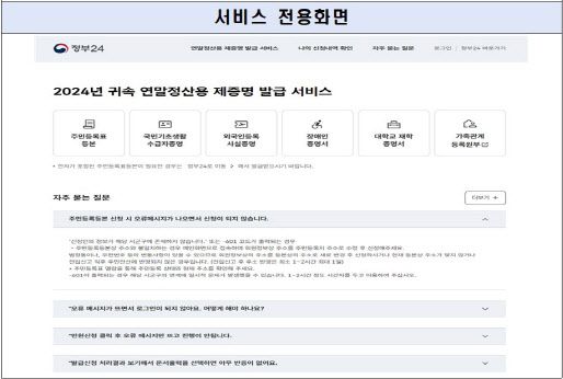 행안부는 연말정산 기간에 이용자 접속이 급증할 것에 대비해 전용창구를 운영하고, 서비스 분산을 위해 순번 대기 표시기능을 적용하는 등 불편을 최소화해 정부24 운영의 안정성을 높인다는 계획이다.
