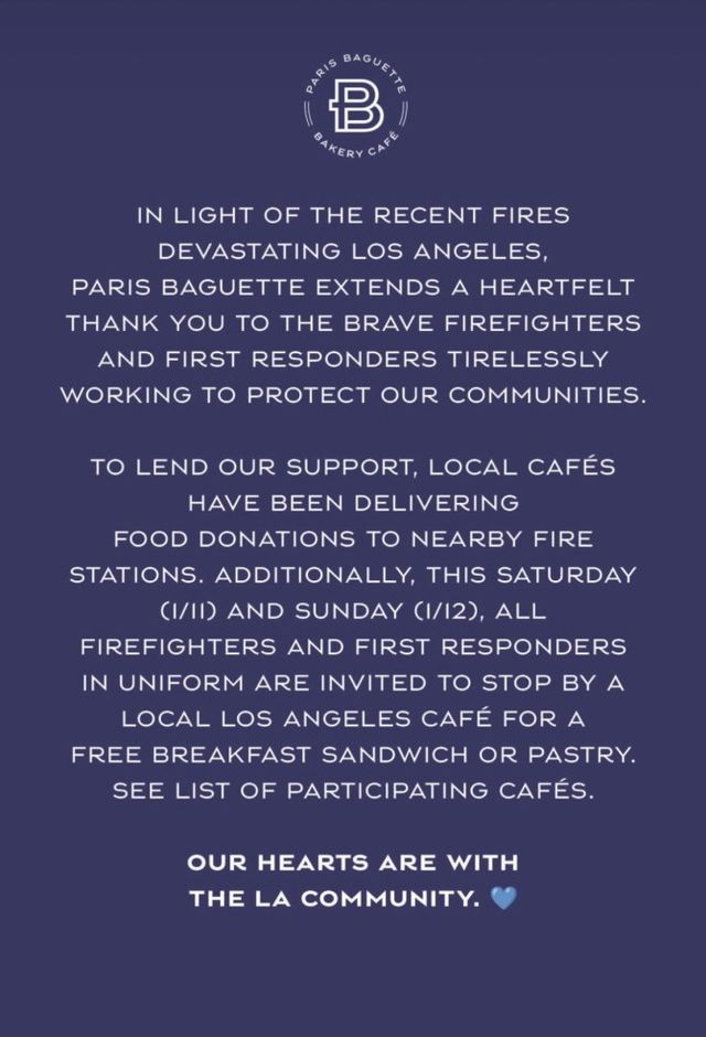 파리바게뜨 아메리카본부 관계자는 "Nourish Community(지역 사회 기여) 브랜드 방침을 실천하고자 가맹점들과 함께 소방관들에게 제품을 지원하게 됐다. LA 지역 사회가 어려움을 극복하는 데 조금이나마 도움이 되길 바란다"고 말했다.