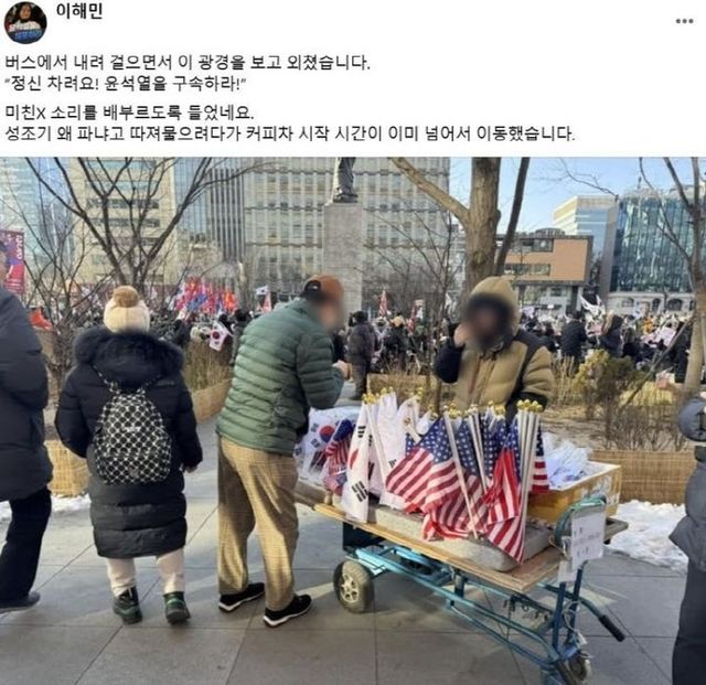 지난 11일 이해민 조국혁신당 의원은 자신의 페이스북에 “버스에서 내려 걸으면서 이 광경을 보고 외쳤다”며 한 시민에게 ‘정신차려요! 윤석열을 구속하라!’고 외쳤다고 했다.