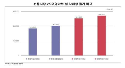 12일 전문가격조사기관 한국물가정보에 따르면 올해 4인 가족 기준 차례상 비용은 전통시장 30만원, 대형마트 40만원이 드는 것으로 조사됐다. 이는 전년동기대비 전통시장은 6.7%, 대형마트는 7.2% 상승한 수치다. 특히 대형마트 비용은 전통시장보다 35.4% 더 비싼 것으로 나타났다.