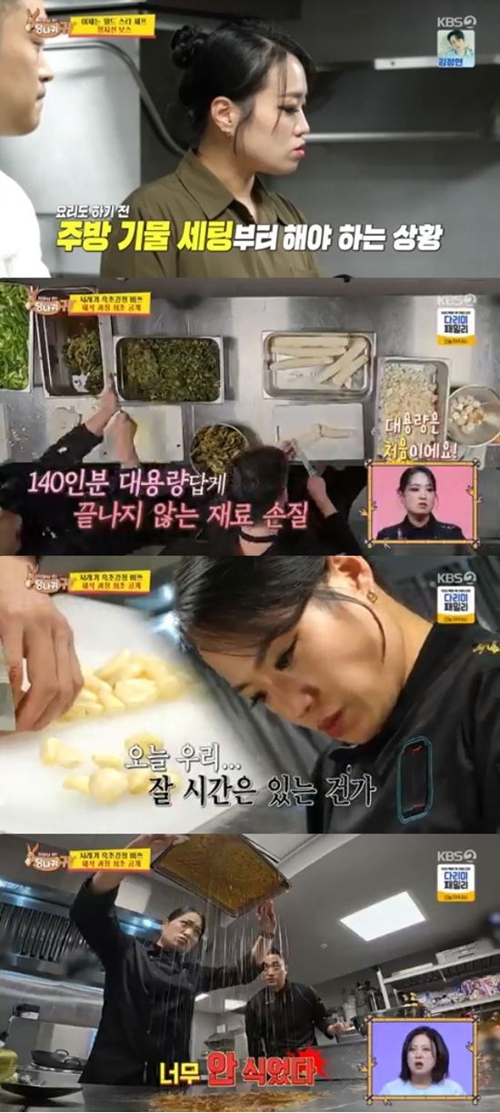 정지선은 요리를 할 주방을 확인하고 기물 세팅이 하나도 안 되어 있는 상황에 난감해 했다. 주방에는 인덕션만 있고 웍질할 화구조차 없었다.