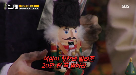 이날 유재석은 기차가 움직이는 크리스마스 오르골 장난감과 호뚜까기 인형을 본인에게 선물했다.
