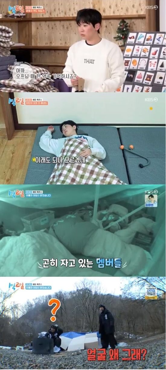 주종현PD는 딱 1명에게만 실내취침을 기회를 주겠다면서 구제 미션으로 카드 뒤집기를 진행했다. 최후의 승리자가 된 딘딘이 혼자 실내취침을 하게 됐다.