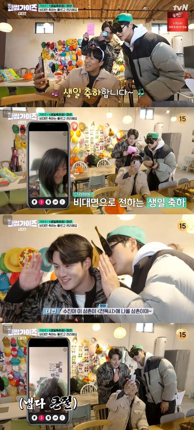 가이즈 팀은 선글라스와 축하 카드, 머리띠까지 갖춰 쓰고 차태현의 막내 딸 차수진에게 영상통화를 걸었다.