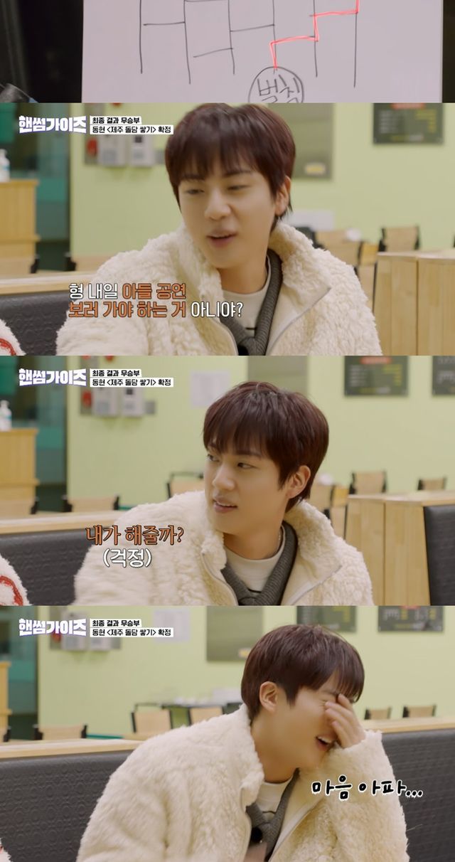 이이경은 "형이 2주 전부터 오늘만 벌칙이 아니길 바라던데"라고 아련하게 이야기했고 진 또한 "형 내일 아들 공연 보러가야 하는 거 아니냐"고 걱정했다.