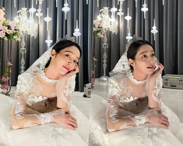 사진 속 이민정은 티아라에 웨딩 베일을 쓰고 시스루에 꽃이 핀듯한 웨딩드레스를 입고 포즈를 취하고 있다. 이병헌과 지난 2013년 결혼식을 올렸지만, 여전히 아름다운 자태로 시선을 사로잡는 것.