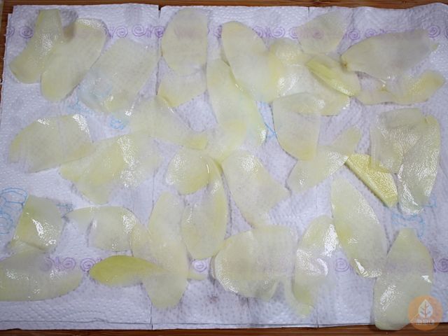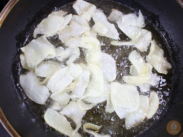 감자가 워낙 얇기 때문에 금세 바삭하게 튀겨져요.