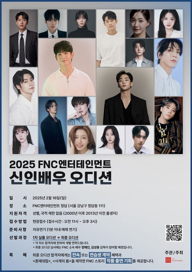 ‘2025 FNC엔터테인먼트 신인배우 오디션’은 서류 현장 접수, 1차 실물 오디션, 최종 오디션으로 진행되며 각 차수 합격자에 한해 개별적으로 합격을 알릴 예정이다. 최종 오디션 합격자에게는 전속 혹은 연습생 계약 혜택이 제공되며, 드라마 ‘혼례대첩’, ‘사계의 봄’ 제작사인 FNC스토리가 제작하는 작품에 출연할 기회가 주어진다.