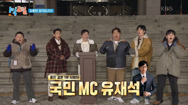 오프닝 장소인 KBS 본관 앞에 마련된 연설대 앞에 선 김종민은 “오늘이 그날이 될 줄 몰랐다. 저 김종민 장가간다. 날짜는 4월 20일 오후 6시”라고 발표했다.