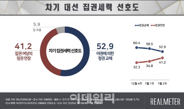 연령대별로는 40대(73.2% vs 24.2%) 50대(65.3% vs 30.3%)에서 정권 교체 의견이 우세했으며, 70세 이상(43.0% vs 63.8%)에서는 정권 연장론이 더 많았다.