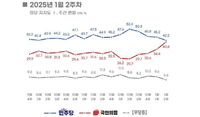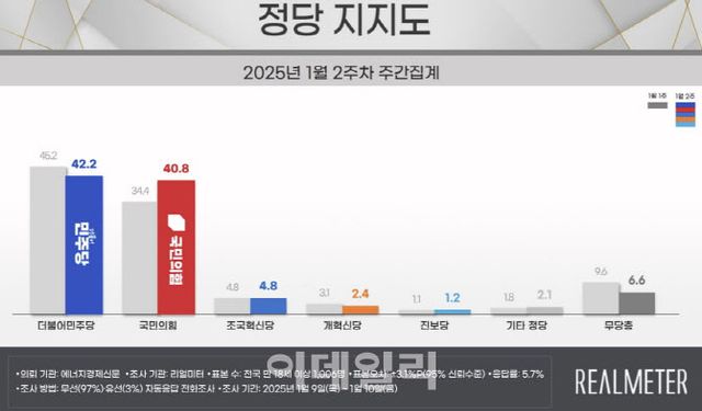 여론조사 전문기관 리얼미터가 에너지경제신문 의뢰로 지난 9일부터 10일까지 이틀간 전국 18세 이상 유권자 1006명을 대상으로 정당 지지도를 조사한 결과민주당은 42.2%, 국민의힘은 40.8%로 조사됐다.