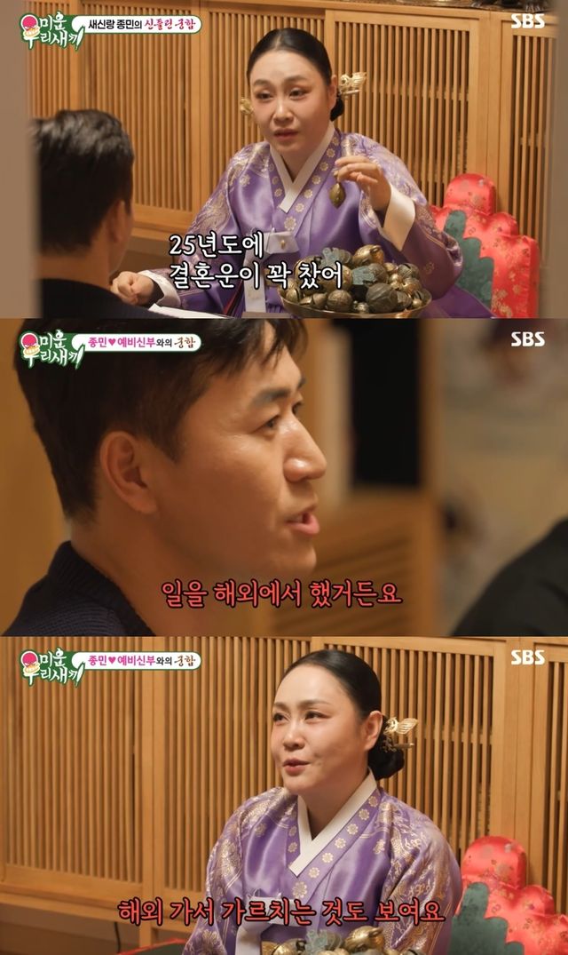 또 아내에 대해서는 "굉장히 똑똑하고 지식 있고 영리하고, 칼도 보이고 해외도 보인다"며 "가방끈도 해외에 걸려 있다"고 분석했다. 실제로 김종민의 예비 아내는 해외에서 학업을 수행한 적 있다고.