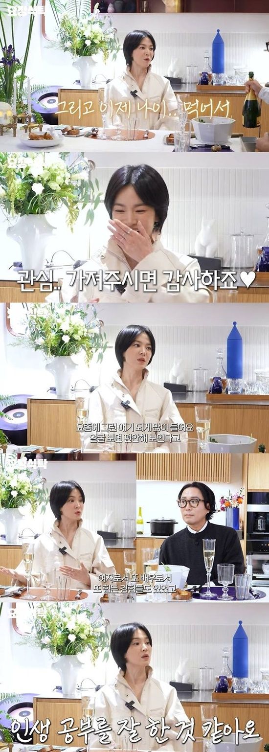 송혜교도 이를 인정하며 "요즘 그런 이야기를 많이 듣는다. 얼굴이 편안해보인다고 하더라. (그동안) 제게 많은 일들이 있었다. 살면서 좋은 경험도 많고, 여자로서 배우로서 힘든 경험들도 있었다"고 솔직하게 말했다.