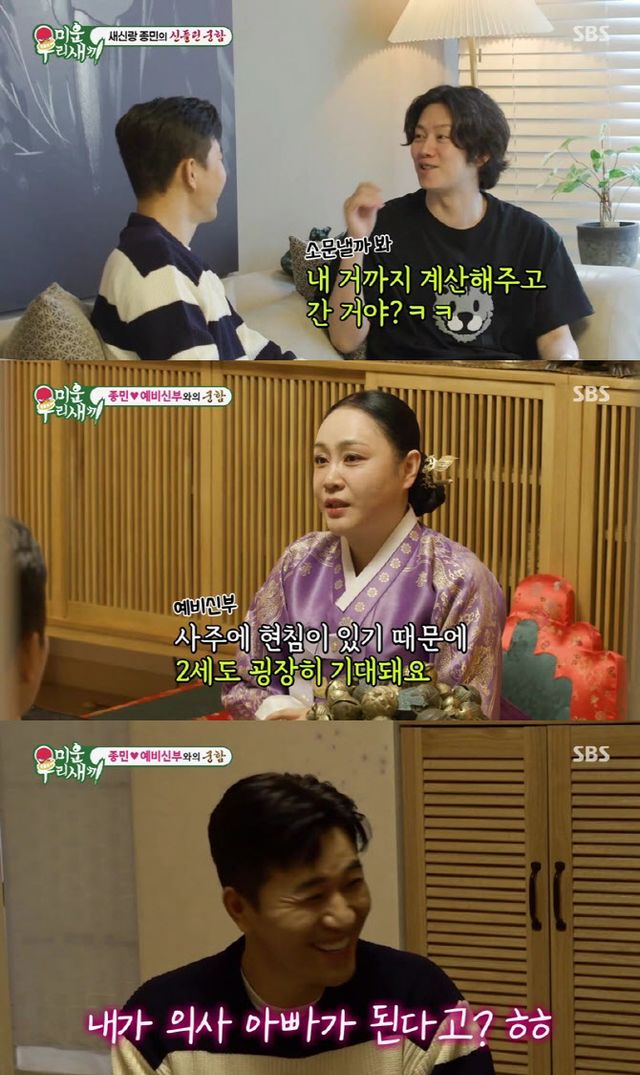 무속인은 “결혼하고 1~2년에는 싸울 일을 만들지 말아라. 크게 싸우면, 부딪히면 이별수가 있다”고 말했다.이어 “종민 씨 사주에는 뭘 해도 3년을 넘기기 힘든 게 있다. 결혼 초반에는 절대 싸우지 마라”라고 덧붙여 모두를 놀라게 했다.