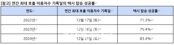 특히 지난 3년간 연도별 택시 호출 이용자수가 가장 많은 날의 탑승 성공률은 각각 71.3%, 75.4%, 83.4%로 매년 상승세를 보였다. 탑승 성공률은 택시 호출을 시도한 이용자가 실제로 택시에 탑승해 운행을 완료한 비율을 나타내는 수치다.