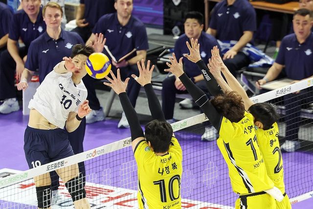 인천 계양체육관에서 열린 남자 프로배구 KB손해보험 전에서 공격을 시도하는 대한항공 정지석(왼쪽)