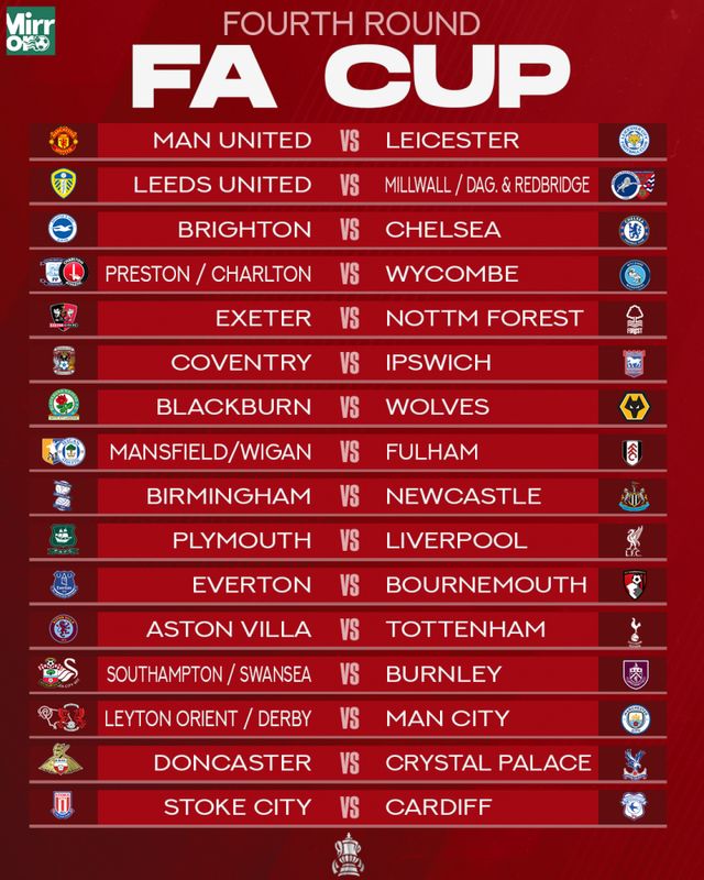 ▲2024~25 잉글랜드 FA컵 4라운드 대진(왼쪽이 홈팀)