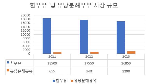 국내 유당분해우유 시장 규모는 1200억원을 넘은 것으로 추산된다. 2021년 655억원에서 2022년 940억원, 2023년 1200억원으로 커져 3년 새 84% 성장했다. 같은기간 전체 흰우유 시장이 9% 감소한 것과는 대조된다. 전체 우유 시장에서 유당분해우유 시장이 차지하는 비중도 3.5%에서 7.2%로 커졌다.