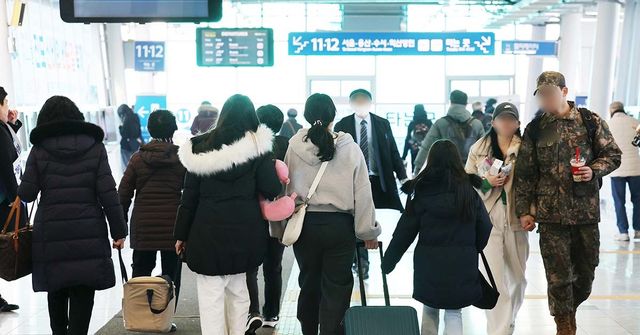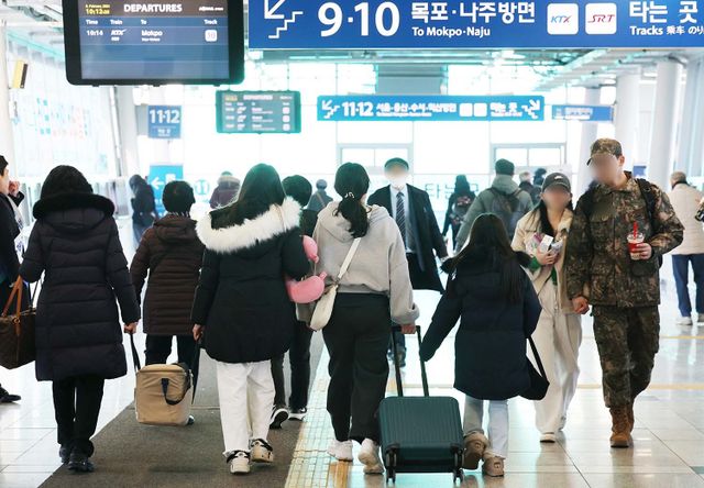 설 연휴를 하루 앞둔 2024년 2월 8일 광주시 광산구 송정역에서 귀성객들이 KTX를 타기 위해 이동하고 있다. / 뉴스1