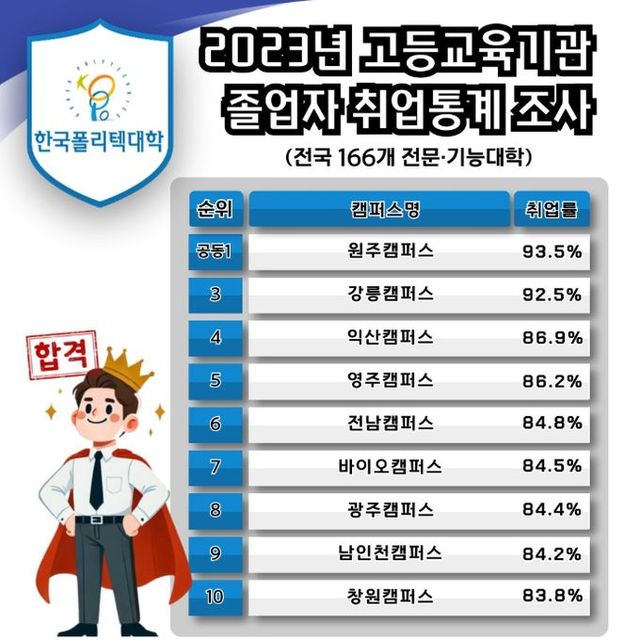 폴리텍대학은 ‘2023년 고등교육기관 졸업자 취업통계조사’에 따른 취업률과 유지취업률을 12일 발표했다.