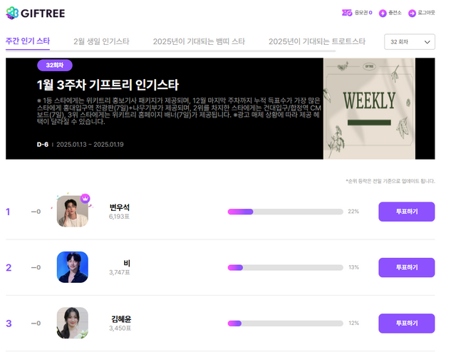 1월 13일부터 진행되는 1월 3주차 기프트리 인기스타에서는 기사를 작성하고 있는 시점을 기준으로 6,193표를 획득한 변우석이 1위를 차지하고 있으며 그 뒤를 이어 비가 3,747표, 김혜윤이 3,450표로 각각 2위, 3위를 차지하고 있다.