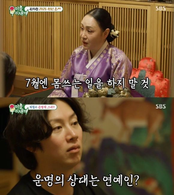 이날 무속인은 김희철에게 “덤으로 사는 인생이다. 20대 때 고비가 있었다. 그때 몸의 축이 망가졌다”며 “올해 7월, 여름에도 조심해야 한다. 골절이나 어디가 부러지면 진짜 장애인도 될 수 있다. 절대 몸을 쓰지 마라”고 경고했다.