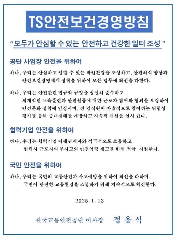 TS 정용식 이사장은 “TS 전국 사업장과 협력기업의 안전 확보와 함께 국민이 안전하게 이용할 수 있는 사업장 환경을 적극 조성해 나가겠다”면서, “올해 중대재해 ZERO 목표를 달성할 수 있도록 안전관리에 최선을 다하겠다”고 밝혔다.