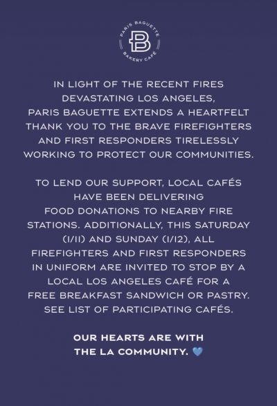 파리바게뜨 아메리카본부는 "지역 사회 기여하는 브랜드 방침을 실천하고자 가맹점들과 함께 소방관들에게 제품을 지원하게 됐다"며 "LA 지역 사회가 어려움을 극복하는 데 조금이나마 도움이 되길 바란다"고 말했다.