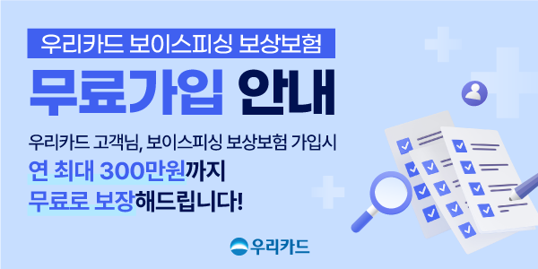 보이스피싱 보상 보험 무료 가입 서비스는 우리 독자 카드 및 우리WON페이 고객 대상으로 보이스피싱 피해 금액(연 최대 300만원)을 보상해준다. 전용 가입센터로 유선 신청하면 되고, 가입신청 완료 다음날로부터 1년간 보장한다.
