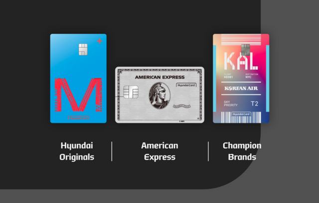 현대카드의 신용카드 상품은 크게 세 라인업으로 구성돼 있다. 먼저, M·X·Z 등 현대카드 대표 상품과 the Purple, the Red, the Green Edition3 등 프리미엄 상품을 포함하는 GPCC(범용신용카드) 현대 오리지널스(Hyundai Originals), 글로벌 신용카드사 아메리칸 익스프레스(American Express)의 프리미엄 상품인 아멕스, 그리고 여행·항공, 쇼핑, 여가, 생활 등 각 업계 최고의 브랜드와 함께 선보이는 PLCC(상업자 전용 신용카드) 챔피언 브랜드(Champion Brands)다.
