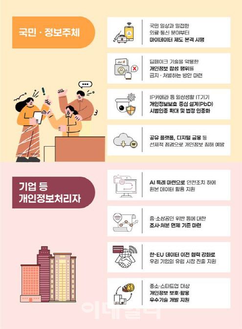 이 밖에도 개인정보위는 ‘마이데이터(개인정보 전송요구권)’ 제도 안착을 위해 의료·통신·에너지 분야부터 본격 시행에 나선다. 구체적으로 △맞춤형 만성질환 예방 관리 △해외 체류 국민 국내 의료 기록 연동 △복약 관리 및 약물 처방 지원 △최적 통신요금 추천 △여행지·여행경비 최적 설계 제안 등 선도서비스 5종을 단계적으로 출시할 예정이다.
