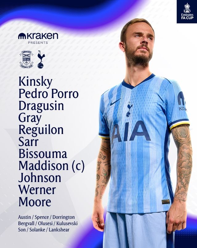 토트넘은 12일(한국시간) 영국 탬워스의 '더 램 그라운드'에서 열린 2024-2025 FA컵 3라운드 원정 경기에서 5부 리그 내셔널리그 소속 탬워스와 전·후반을 0-0으로 비긴 뒤 이어진 연장전에서 3골이 터지며 3-0으로 이겼다.