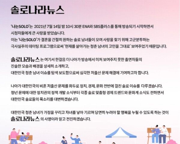 '솔로나라뉴스'는 '나는 솔로' 프로그램에서 다루지 못했던 출연자들의 이야기와 대한민국 솔로들의 다양한 이슈를 심층적으로 다룰 예정이다. 특히, 비혼과 저출산 문제와 같은 사회적인 문제에 대한 다각적인 분석과 해결책을 제시하며 솔로들의 목소리를 대변할 계획이다.