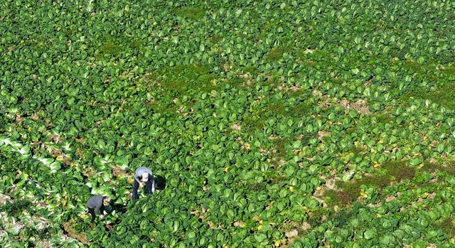 전남 해남군의 한 배추밭에서 농민들이 배추를 수확하고 있다. 해남은 전국 최대 배추 주산지로 유명하다. / 연합뉴스
