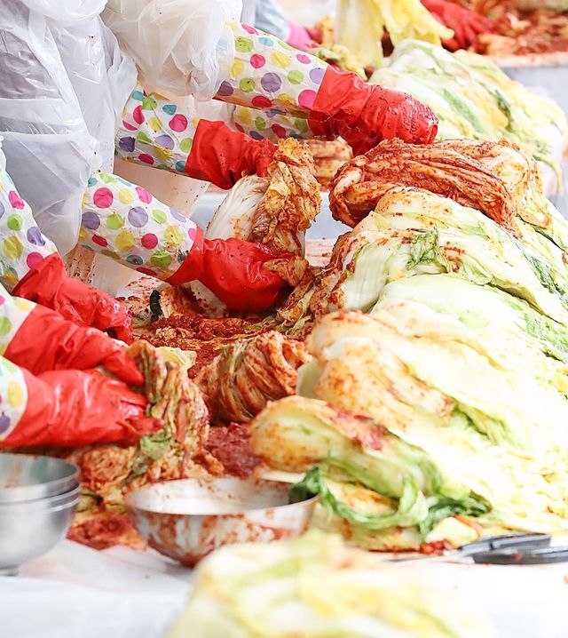 '사랑의 김장 나눔 축제'에 참여한 자원봉사자들이 배추에 양념을 버무리고 있다. / 뉴스1