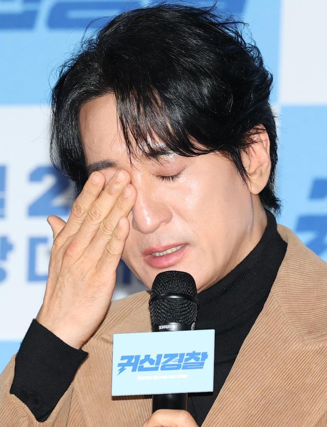 배우 신현준이 13일 서울 용산구 CGV용산아이파크몰에서 열린 영화 '귀신경찰'(감독 김영준) 언론시사회에 참석해 고 김수미 생각에 눈물을 흘리고 있다. / 뉴스1