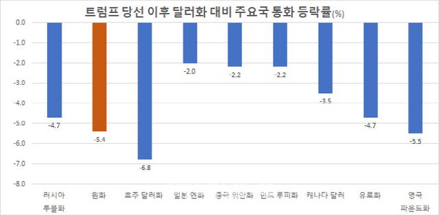 차별적인 고(高)성장을 이어가는 ‘미국 예외주의’에 도널드 트럼프 미 대통령 당선인의 대선 승리가 몰고 온 달러 강세 영향을 감안해도 원화의 약세는 다 설명이 되지 않는다. 미 대선 이후인 지난해 11월 6일 이후 달러 대비 원 가치는 5.4% 하락했다. 이는 주요국 가운데 호주 달러(-6.8%)에 이어 두 번째로 큰 낙폭이다. 호주 달러는 호주중앙은행(RBA)이 금리 동결기를 끝내고 다음달 금리 인하를 시작할 것이라는 전망 속에 최근 큰 폭의 하락세를 보이고 있다. 같은 기간 일본 엔은 달러대비 2.0%, 중국 위안은 2.2%, 유로는 4.7% 각각 하락했다.