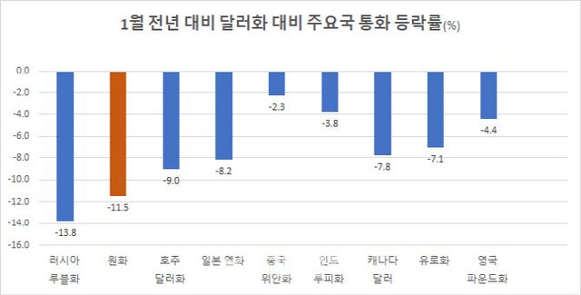 13일 엠피닥터에 따르면 이달 10일 기준 미 달러 대비 원의 가치는 11.5% 하락했다. 이는 주요국 통화 중에선 우크라이나와 전쟁 중인 러시아 루블(13.8%) 다음으로 큰 폭으로 떨어졌다. 일본 엔(-8.2%)와 중국 위안(-2.3%) 등 주변국과 비교했을 때도 낙폭이 크다.