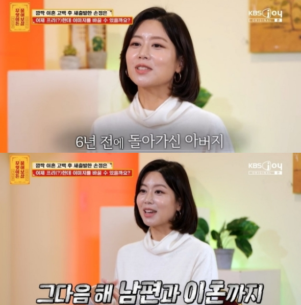 이어 손정은은 퇴사 후 근황을 전하며 부친상과 이혼의 아픔을 겪었다고 털어놨다. 그는 “퇴사한 지는 3년 정도 됐다”며 “제가 외동딸인데 6년 전 아버지가 돌아가셨다. 그다음 해에는 남편과 이혼했다. 방송을 해야 하니까 항상 밝게 웃어야 했다. 점점 정신적으로 힘들고 마음이 공허해졌다”고 말했다.