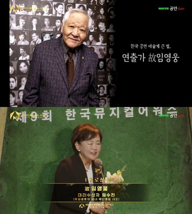 한국 최초의 창작 뮤지컬 '살짜기 옵서예'를 연출한 故 임영웅 연출가가 뮤지컬 분야에 공을 세운 전문가나 단체를 별도로 선정해 수상하는 공로상을 차지했다. '컴프롬어웨이'의 홍유선이 안무상을 받았다.