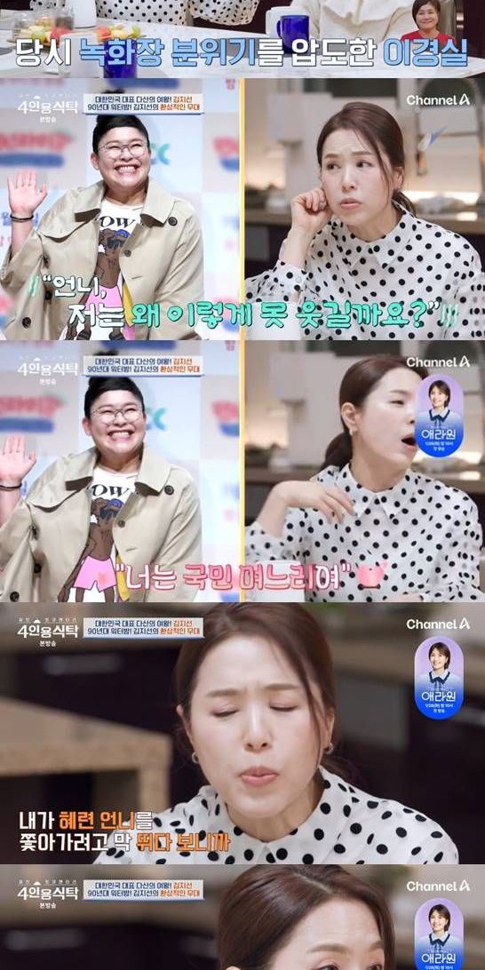 김효진은 "언니가 그런 시절이 있었냐"고 물었고, 김지선은 "경실이 언니는 거기 분위기를 압도하지않냐. 막 웃으면서 들었다 놨다 하고 혜련이도 개인기하는데 나는 뭘 어떻게 해야할지 모르겠는거다. 그때 이영자 언니가 해준 얘기가 있다"라고 말해 시선을 모았다.
