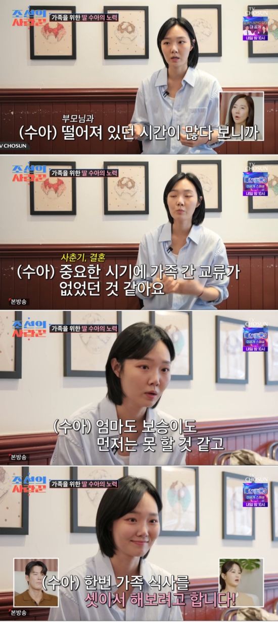 손수아는 "저희한테도 커뮤니케이션 시간이 익숙하지가 않다. 이 시간을 억지로라도 가져서 아직 어색하겠지만 노력을 해보고 싶은데 엄마도 보승이도 먼저는 못할 거 같고 제가 그나마 나서야 되지 않을까 생각이 들었다"라며 털어놨다.