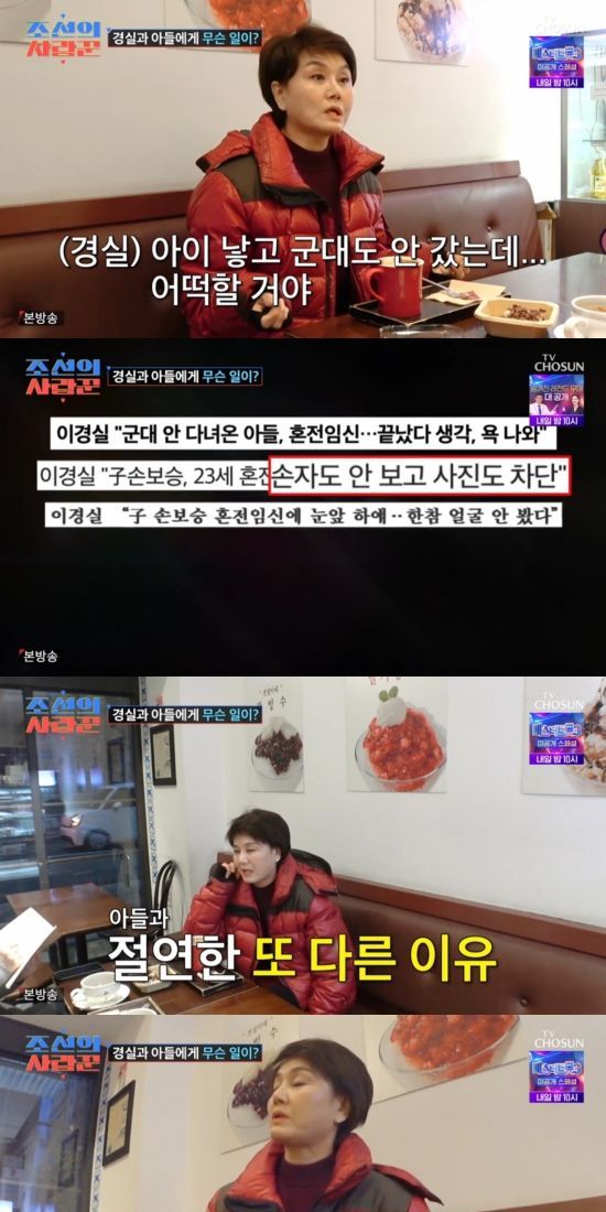 이날 이경실은 아들 손보승과 1년 동안 절연한 이유에 대해 "군대라도 갔다 왔으면 괜찮은데 아이 낳고 군대도 안 갔는데 어떡할 거야? 저 하나도 책임도 못 지면서. 내가 겪은 어려움은 눈앞이 캄캄하진 않았다. 머릿속이 하얘지진 않았었다. 군대도 안 간 아들이 23살에 아이를 가졌다고 하는데 그건 어떻게 할 수 있는 방법이 아니더라. 그냥 까마득하더라"라며 탄식했다.