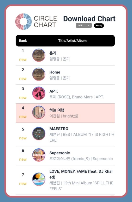 이찬원은 써클차트가 최근 발표한 2024년 연간 차트에서 '하늘여행'으로 다운로드 차트 4위를 차지했다.