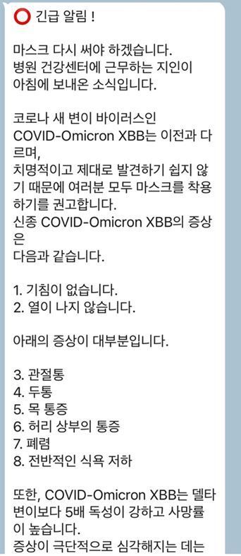 "긴급 알림!"이라는 말로 시작하는 메시지는"치명적인 코로나19 새 변이 'XBB'가 발생하고 있다"는 내용을 담고 있다.