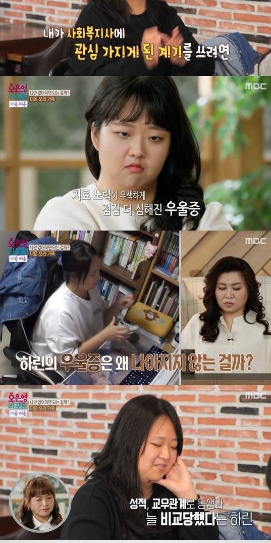 첫째 딸이 숨기고 싶었던 것은 오랜 기간 앓았던 ‘우울증’이었다. 초등학교 때 소아 우울증을 진단받고 그 이후부터 미술치료와 상담 치료 등 각종 심리치료를 받아보고 수없이 병원을 옮겨 다니면서까지 치료를 해보려고 했다.
